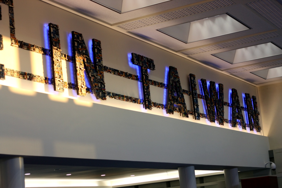 IN THE TAIPEI AIRPORT, in Taiwan they had this display in a waiting room. The whole sign is computer board parts, and the lighted part I am supposing is the shape of Taiwan.