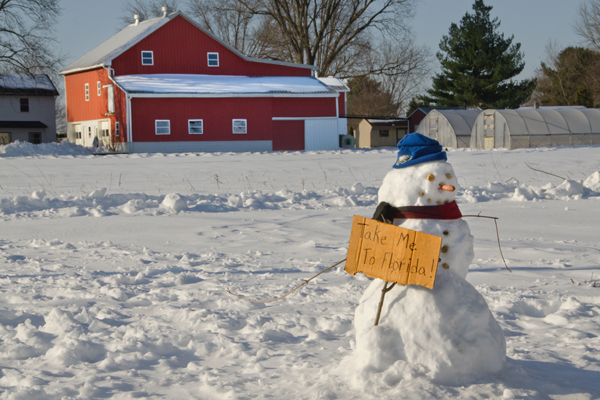 After the recent mid march snow storm hit, some Amish kids created this little snow man complete with a take me to florida sign