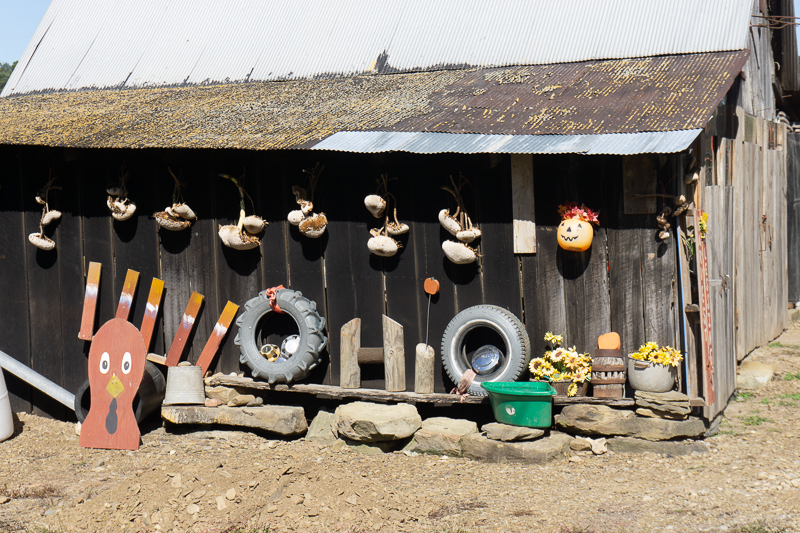 I loved this decor on the wall. A creative way of using old tires, etc. I couldn’t resist turning around and passing by the shed again, to get a photo.