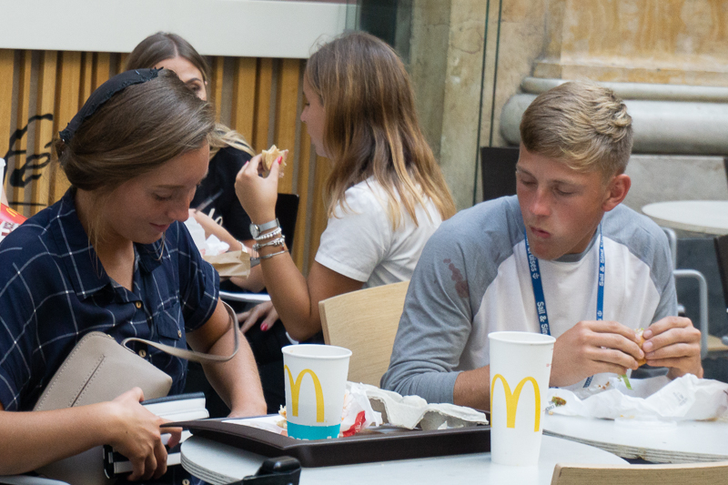 Checking out sibling’s (assumed) purchases, while eating!