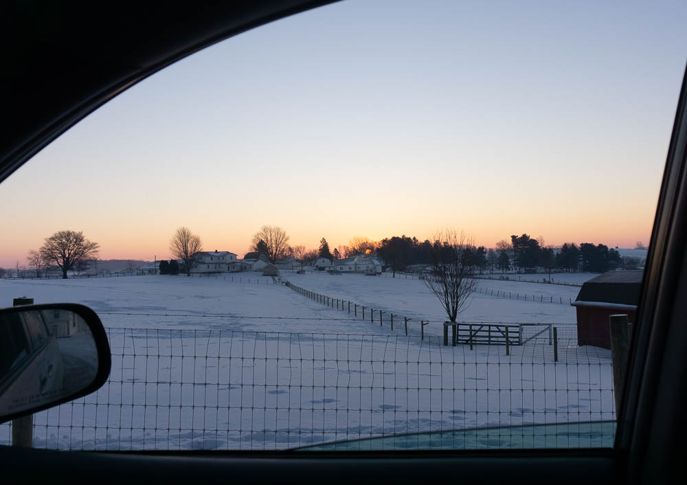 This has been a typical Winter sunrise for the last several weeks in snow-covered Ohio. Not sure if we will see this again before another Winter. It is framed with my passenger side window.