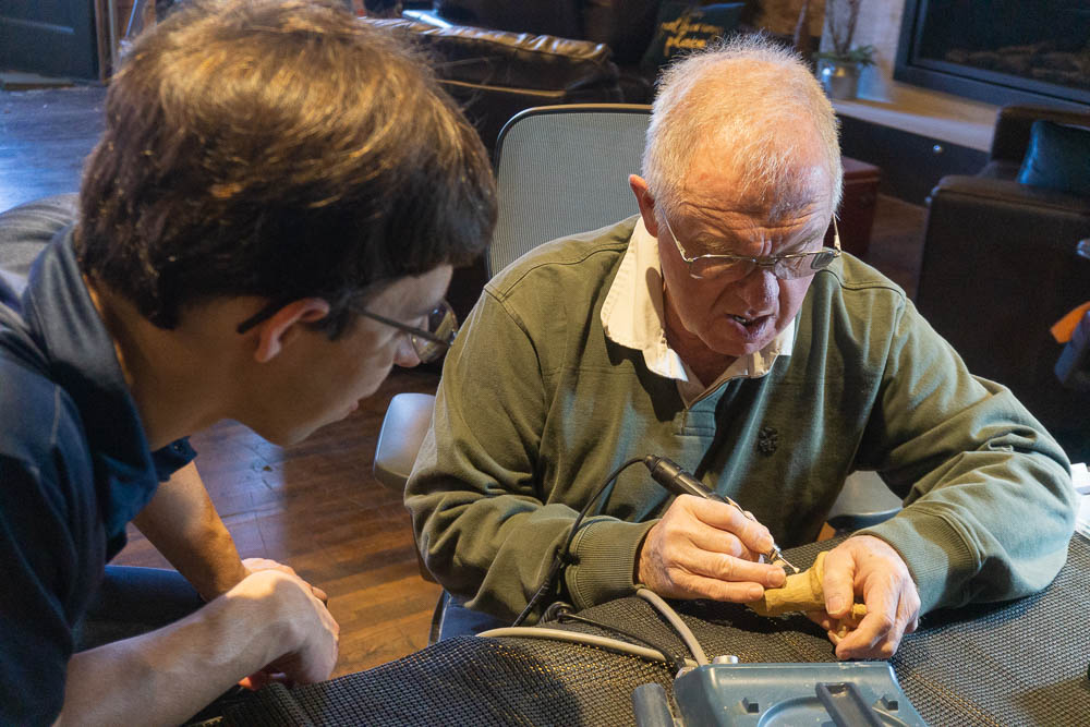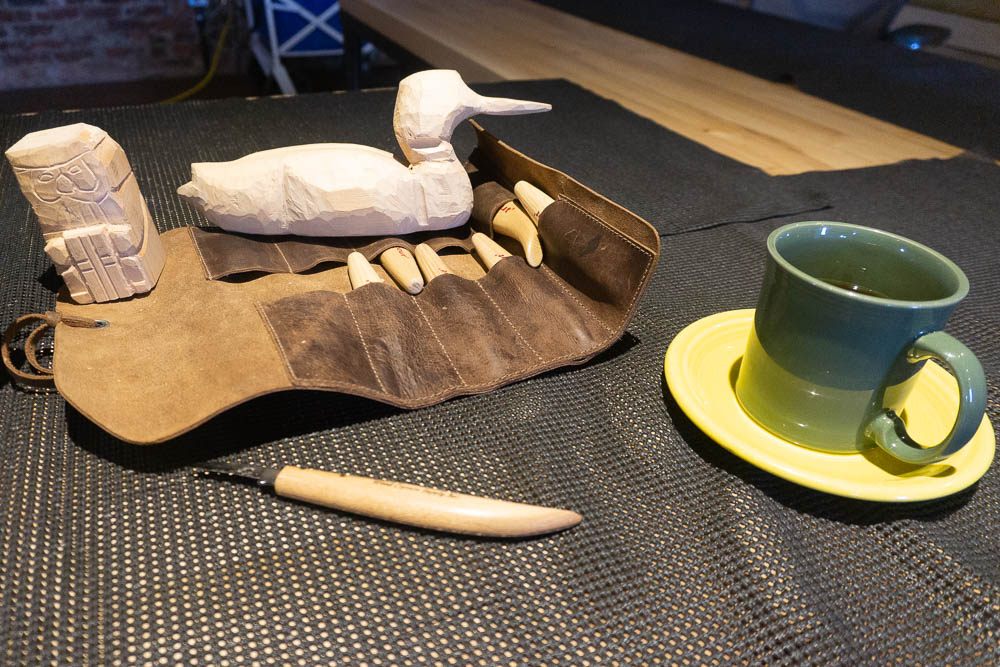 Our carving club met at a local shop on Saturday. Here Dave is demonstrating how to simulate on the young man’s carving of a deer. Also a photo of my tools and cup of coffee!