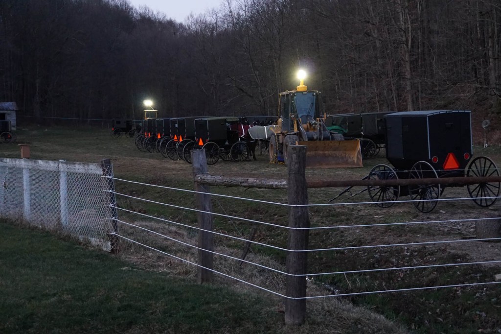 Tragedy struck: A young father and his son were killed when a car hit their horse-drawn cart from the rear. Now the family and friends come together to pay their respects. Here are the carriages parked in an organized fashion.
