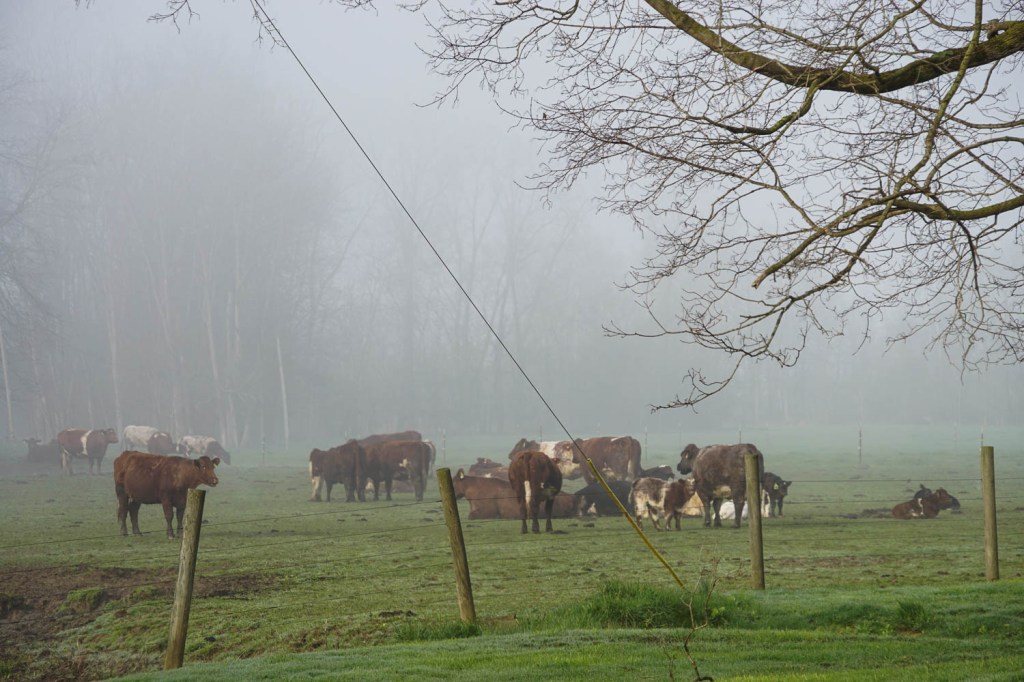 These cows are leisurely chewing their cud, in the foggy, with not a care in the world!