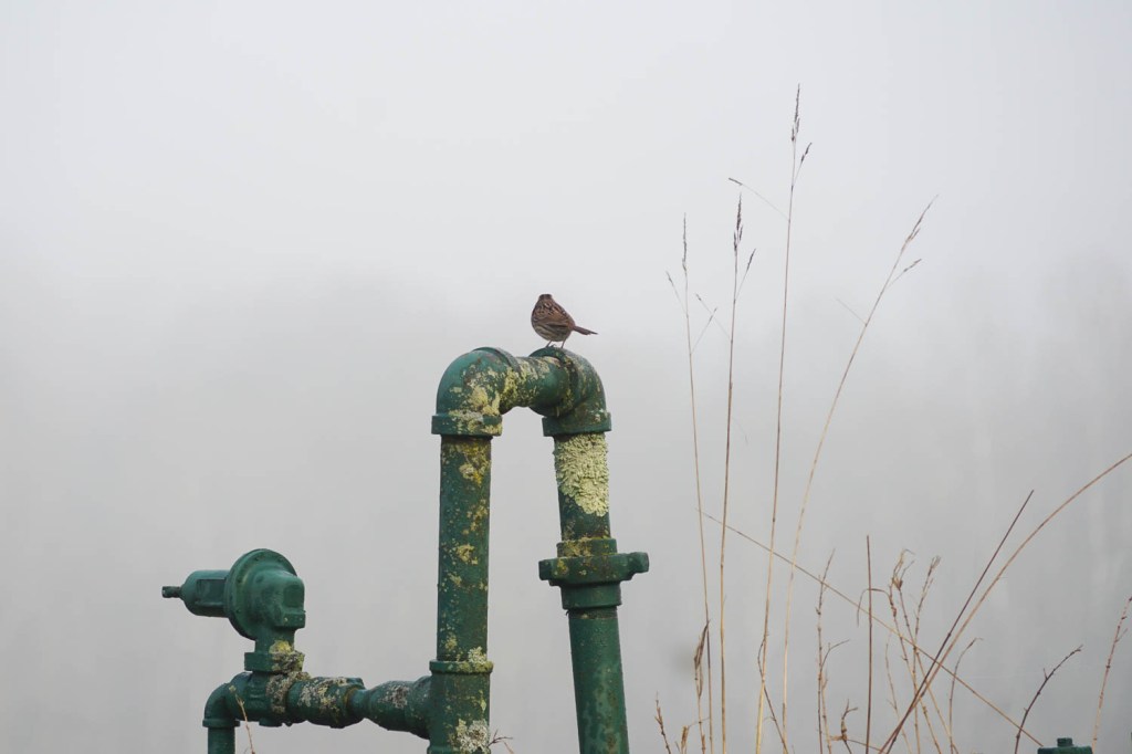 I think this is a Song Sparrow singing his heart out, penetrating the fog with his song!!
