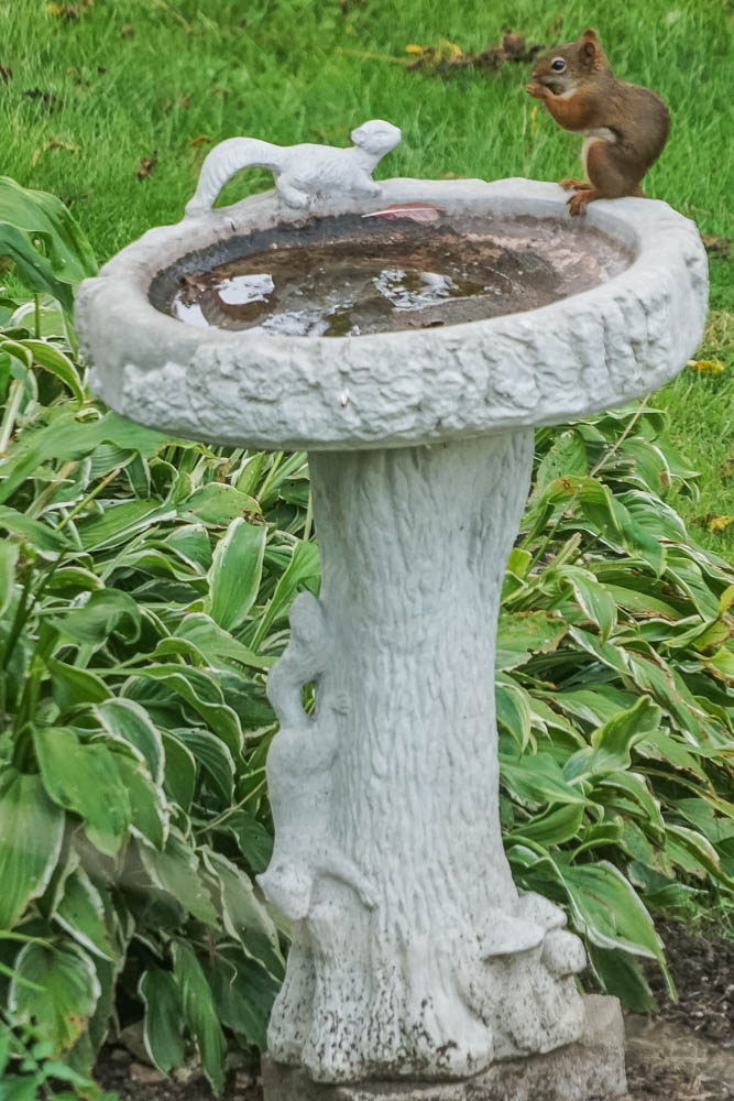 I decided this was a photo moment, when I saw a live squirrel on the bird bath, which had it’s own cement squirrels crawling over it!