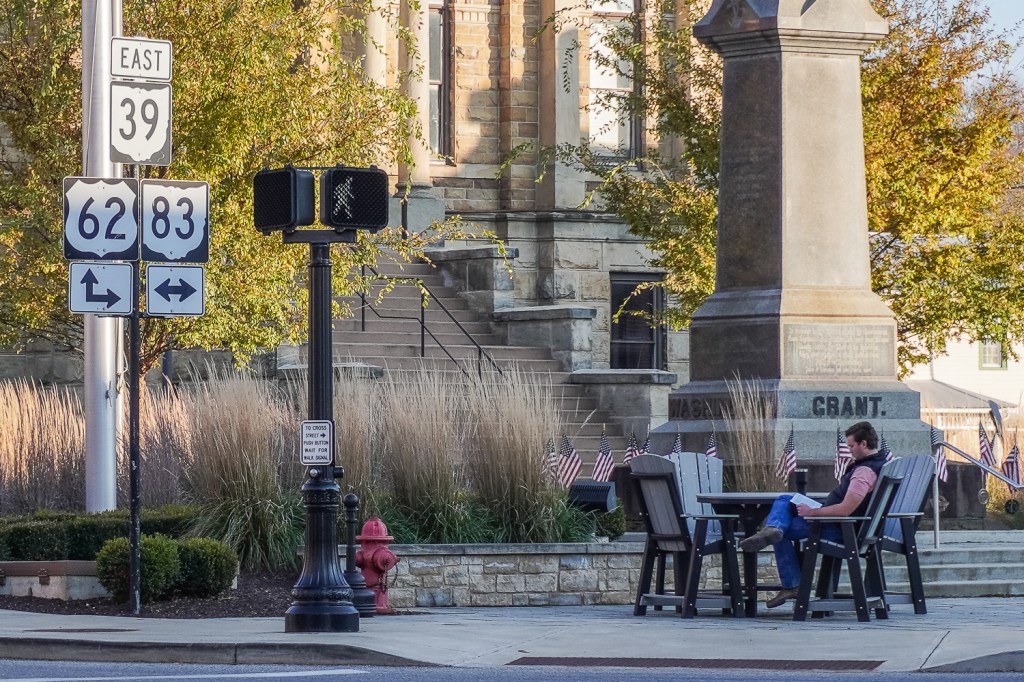 Gentleman enjoying a nice Autumn day at the intersection near the courthouse in Millersburg, Ohio, USA!