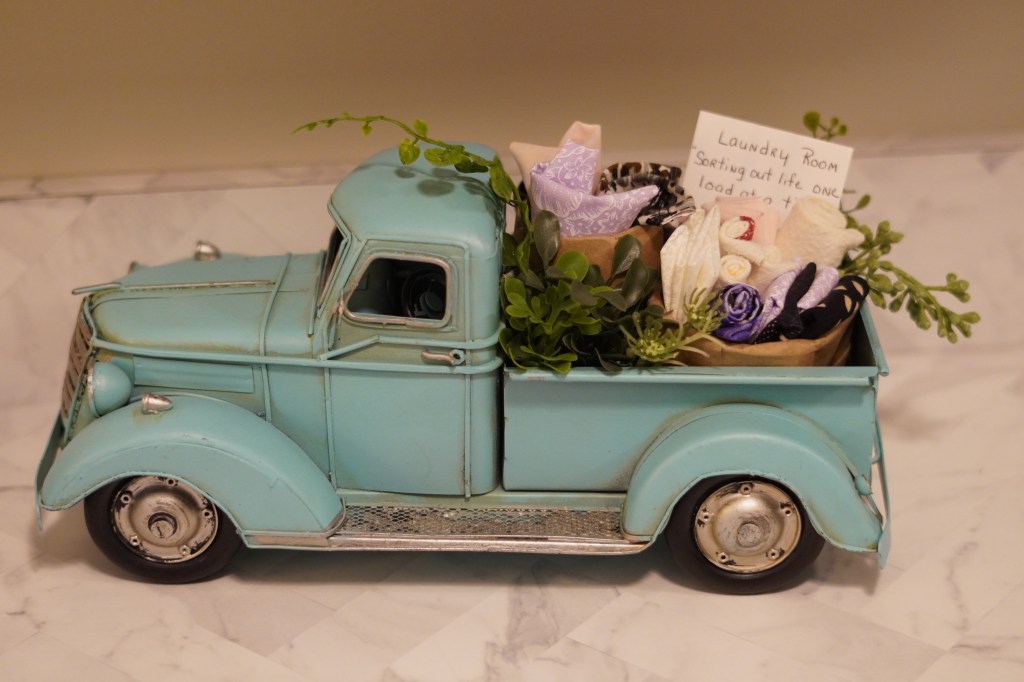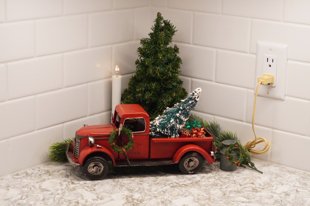 We had a similar pickup on our farm in Iowa, when I was young. The red pickup like this is quite often seen as a Christmas decoration. And for sure, it has an evergreen tree in the back.