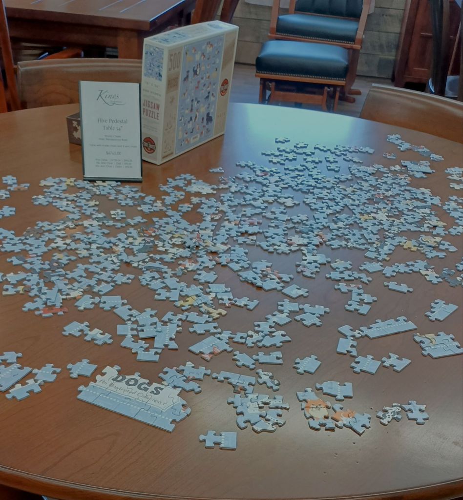 A furniture store decided to put a puzzle on one of their tables. Customers sometimes sit there for hours.
