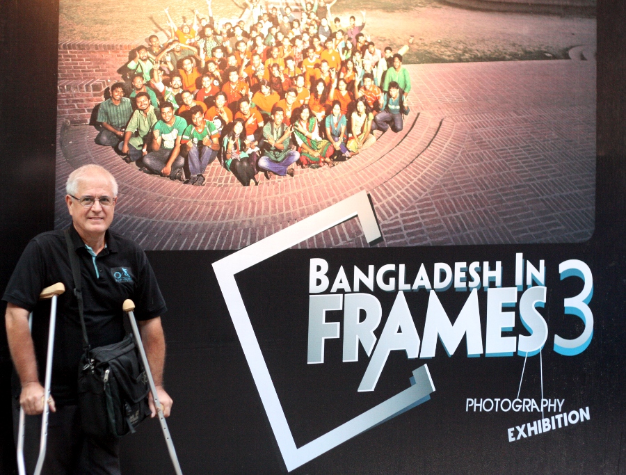 TTL’s “BANGLADESH IN FRAMES 3” PHOTO EXHIBITION is finished. It ran from March 25-29. The photo below was taken outside the gallery. I am also in the group photo on the right hand side. Look for a pale face and white hair. It may be hard to do with the spot light that was aimed at the poster plus camera flash. Day 76 has a better rendition of the group photo.