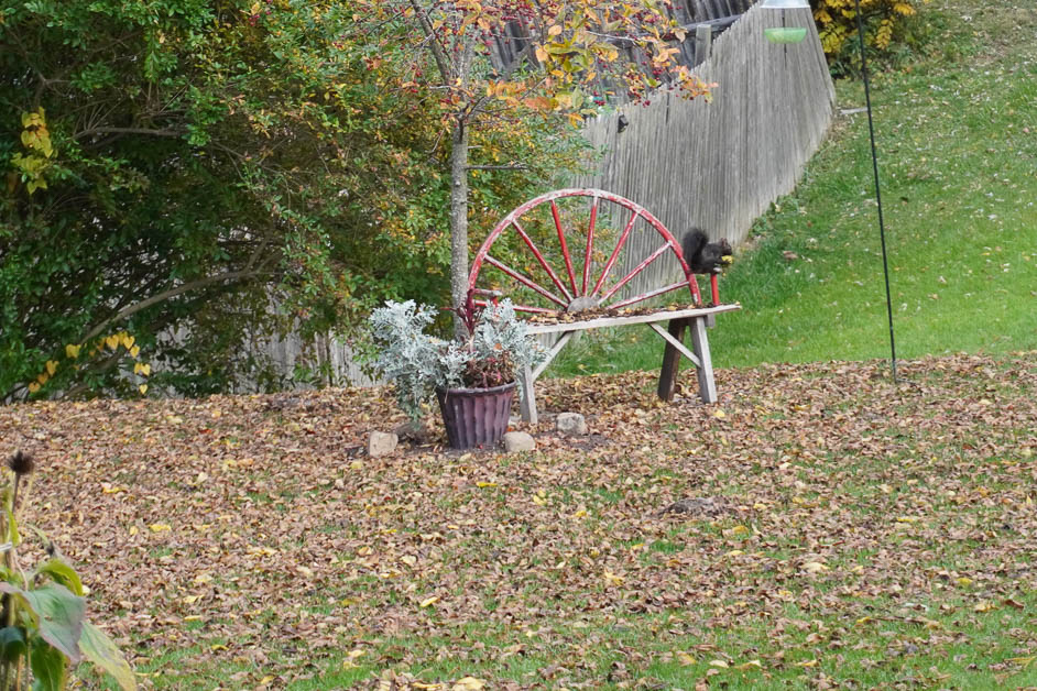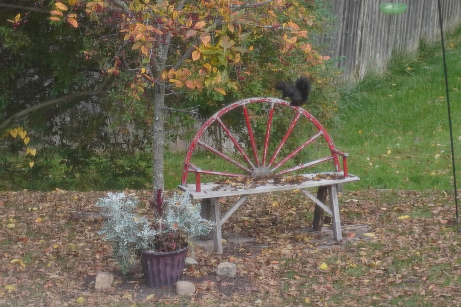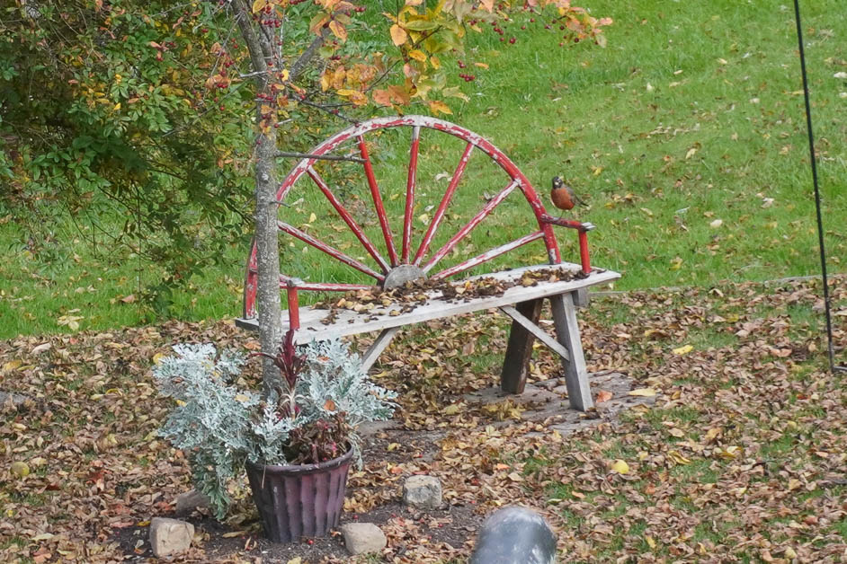 The wildlife seem to like this bench in our backyard. It is a practical way to use the wheels, when they quit “going round and round!”