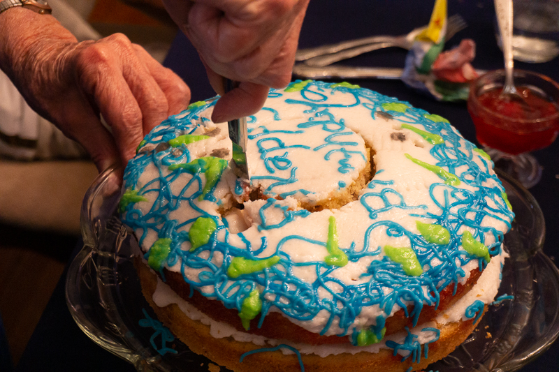 My mother always marked a circle in the center of the cake before cutting the cake, so the pieces wouldn’t have a point on the end! Her she is with her 96th birthday cake!