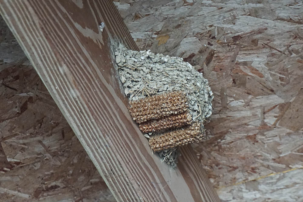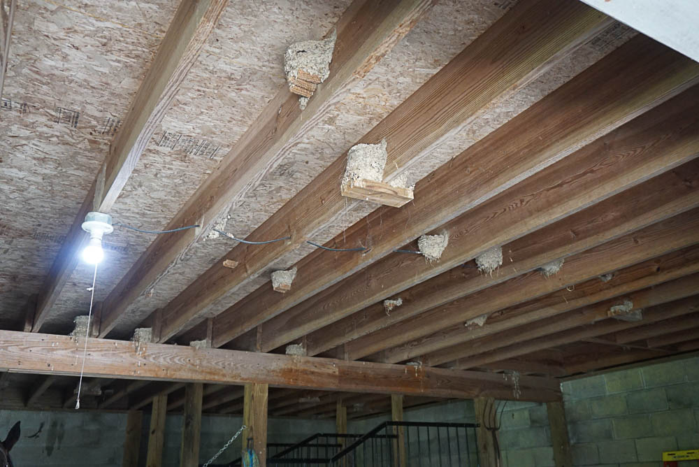While Driving an Amish Farrier to the different farms to shoe horses, it was interesting that this barn had at least 30 barn swallow nests. As you can see, they fastened some corn cobs, for a convenient base, making it possible for many more nests.