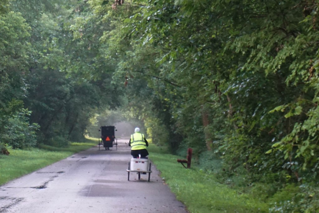 I am not sure I have ever seen any Amish walking on this Rails to Trails trail in Millersburg. The trail is so far from their homes they wouldn’t walk that far. I do see them quite often on the trail with their horse carriages or their bicycles. Over the years they have contributed a lot of money for the trail, because it gives them a safer route than coming to town the whole way on a two-lane highway. I suspect they had been at the nearby hospital, and decided to go for a walk.