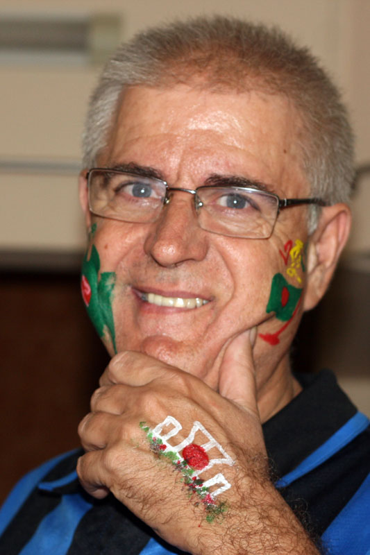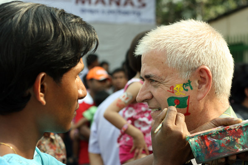 PAINTERS AT WORK on the wall and on my face and hand! I attended the annual Boi Mela (Book Fair) organized by the Bangla Academy on the last day of the month long Mela. They had many painters who were ready to paint the national flag, map or minar. My hand was done free when I ran into the painter I had met earlier but didn’t ask to have any painting done. He insisted on doing my hand at no charge!