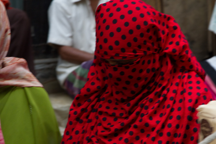 I LOVE THE BRIGHT RED POLKA DOTTED BORQUE ON THIS CONSERVATIVE BENGALI LADY.