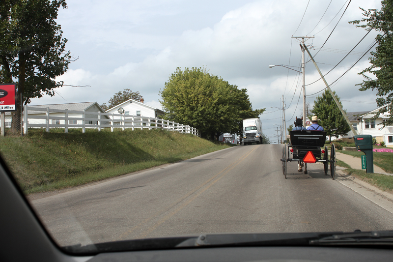 Here I am approaching a horse and buggy (carriage used by the Amish), which is a very common sight in this region of Ohio.