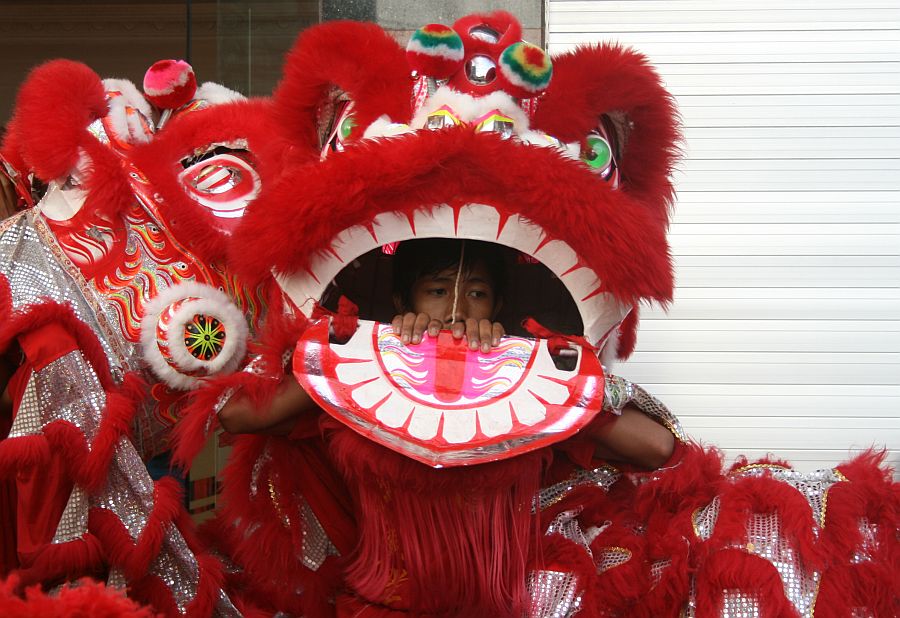 YOUNG BOY PEEKING OUT OF HIS CUSTOM DURING A LULL IN THE DRAGON POLE DANCE.