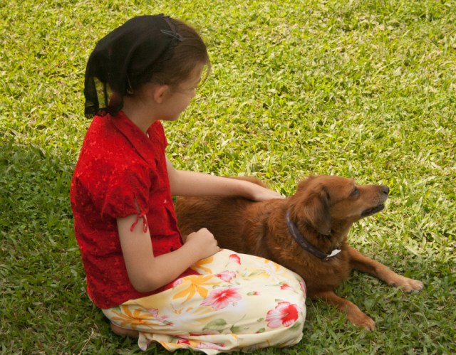 Enjoying the dog and the green grass at the guest house.
