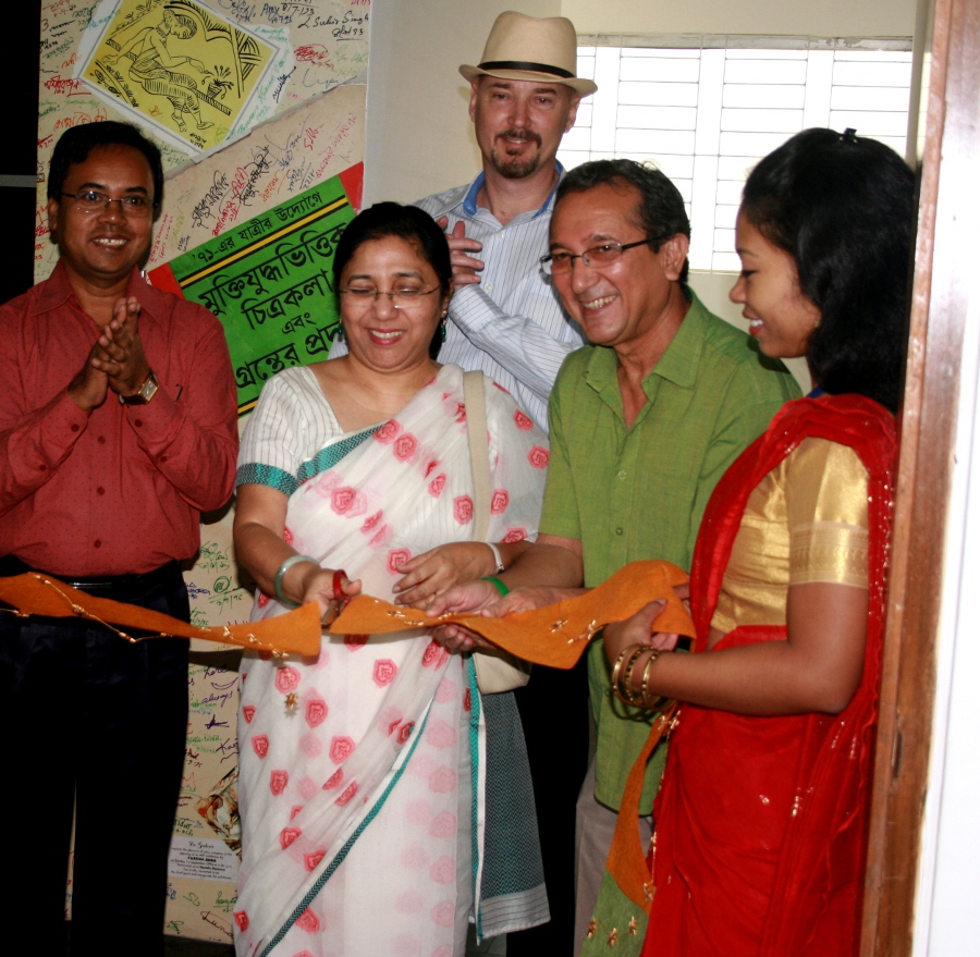 RIBBON CUTTING CEREMONY OF THE DHAKA CRAFT BAZAAR held at “The Gallery” in Gulshan 1, Dhaka. This is a monthly FAIR TRADE festival. My friend Larry is in the background with the hat on. He was one of the organizers of this event.