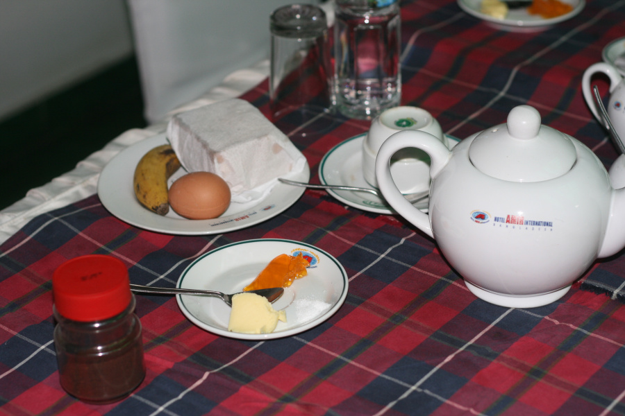 This is the complimentary breakfast served at Hotel Amir in Mymensingh. Boiled egg, toast, banana, and tea was served.