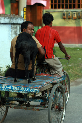 KORBANI EID IS tomorrow so many goats and cows are purchased. This guy is not sure if his goat will stay on the van-gari.
