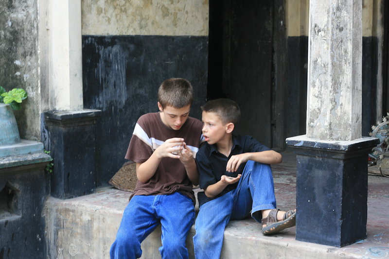 JOSHUA AND NIC TAKING A CLOSE LOOK AT THE COINS AT DHAMRAI METAL CRAFTS. The children were going to buy some of the old coins. Sukanta’s wife decided to treat the children, so she gave them the coins as a gift. Some were stamped with Queen Victoria, and some King George V!