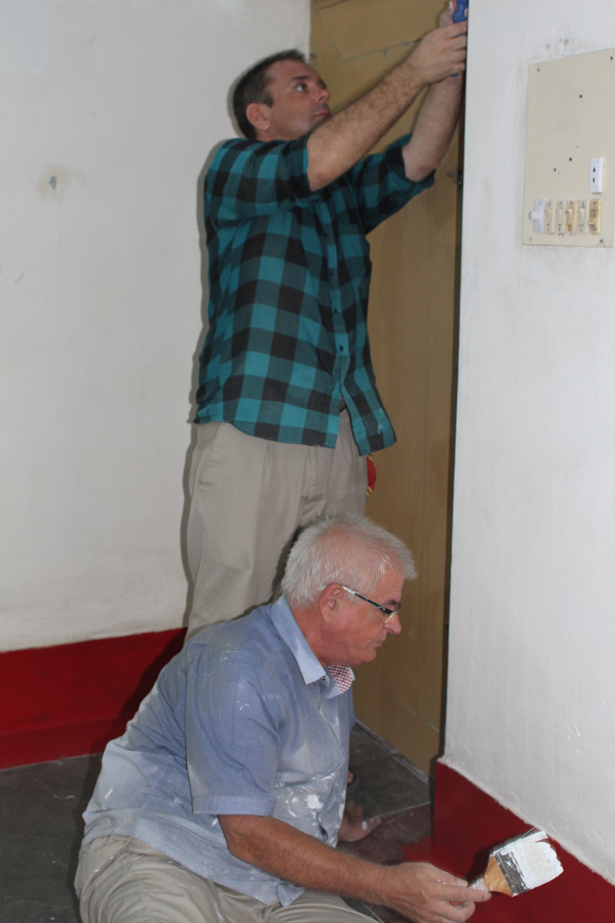We decided to put this home-stay quiet time to work! Many areas of our home getting a fresh coat of paint, or varnish! Below, see one example, with the original dull green replaced with two colors.