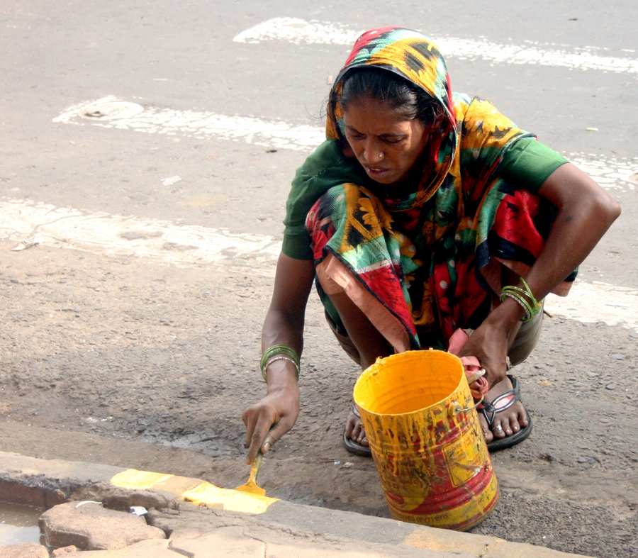 LADY PAINTING THE CURB ON A STREET IN KOLKATA, INDIA.