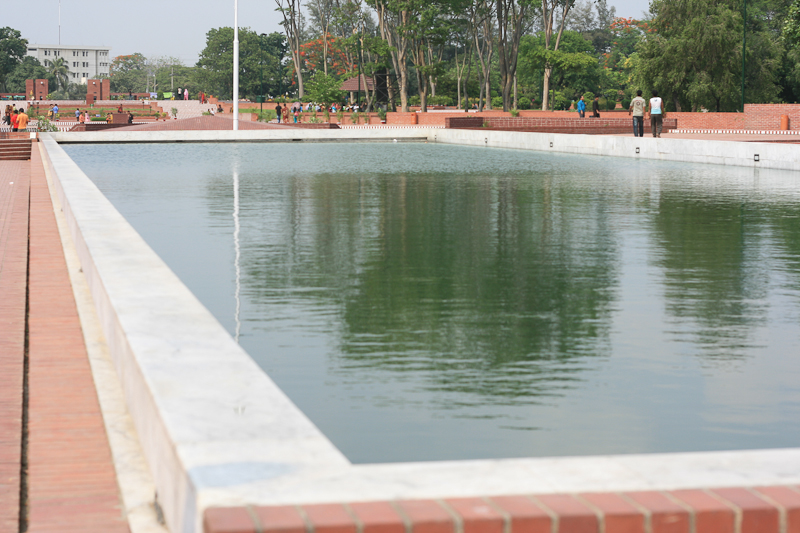Lady beside reflecting pool at the Bangladesh National Monument for Martyrs in Savar.