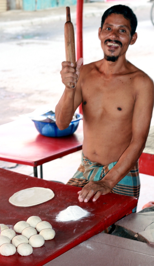 HERE IS A BENGALI MAN MAKING nan ruti.  I ate here this morning and had a piece of this with spicy dal and veggies, as I do 4-6 days a week. This “hotel” is called “Green Hotel.  Sometimes I bring the food home as well.