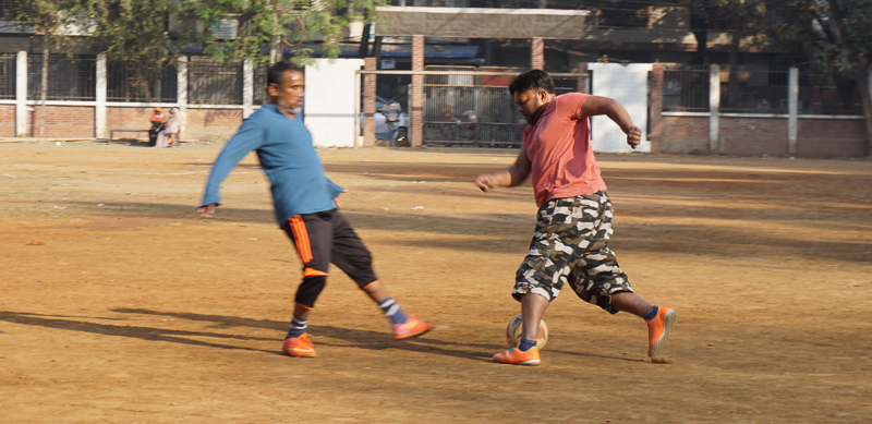 Our oldest grandson playing for the McKinley Bulldogs dribbles the ball while our youngest grandson looks on.