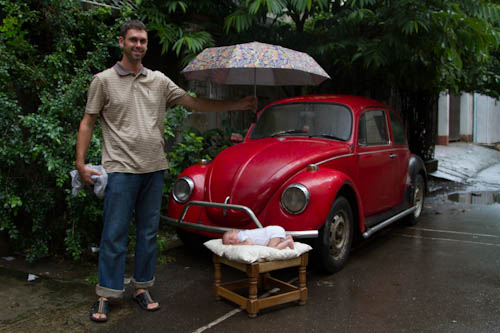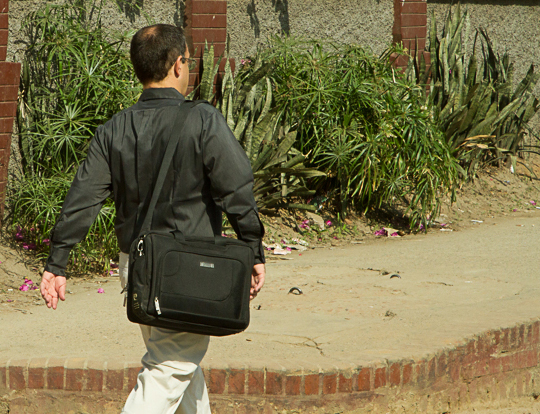 Well, he should be in the air by now on the way to NYC to teach some linquistics. He is 38 years old, so it isn’t the first time he has left home! In fact one of the times he left home, we followed him and now live with him in Bangladesh! This isn’t a photo of him this morning, but one of him walking up the street on another day.
