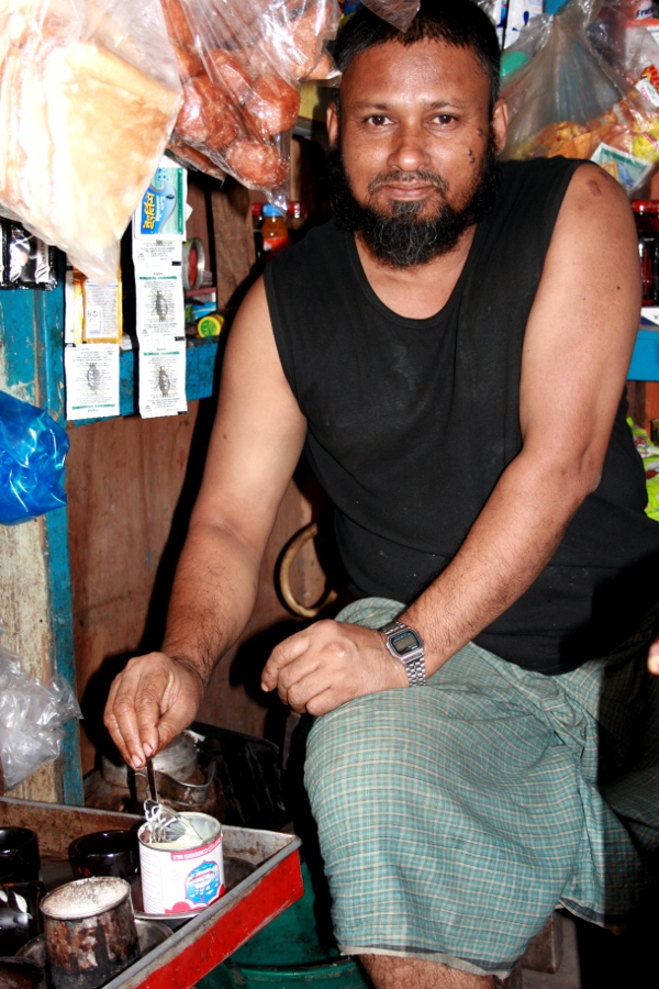 TEA STALL OWNER PREPARING ME A CUP OF TEA. His stand is 50 yards from Jeremy’s apartment, and half way between us and Charles’ place! Sweetened condensed milk, sugar, and some tea are created to make this great drink. Maybe 3 oz. for 6 cents! It’s a rare day that I don’t have a cup of tea. He is wearing a lungi, which is typically what I wear most days at home in the apartment. They are quite comfortable during these 90+ degrees days!
