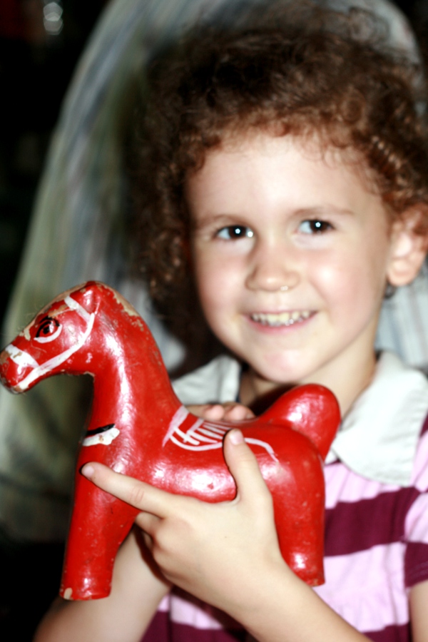 A WOODEN PAINTED TOY HORSE being enjoyed by Candace in a village in the Munshiganj District of Bangladesh.